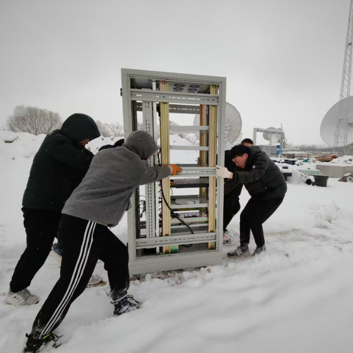 在严寒中,屈生林正把两大卷光纤拿出来,准备搬运到机房。光纤细小脆弱,300多米特别重,在搬运的时候格外小心,不能有任何差错。