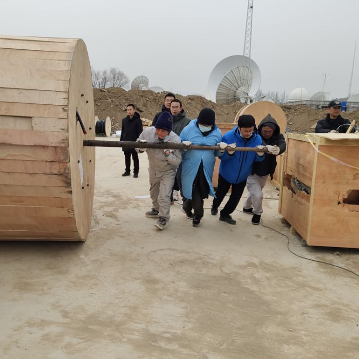 大型线缆的搬运需要很多人来完成,这个巨物足足有两个人那么高。所以大家齐上阵,把线轱辘推到指定位置,方便后续工作。